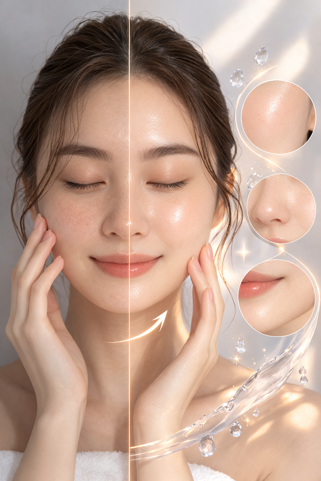 Các thành phần như hyaluronic acid và ceramide có thể giúp cải thiện khả năng giữ nước của da. Khi độ ẩm của lớp sừng được cải thiện, bề mặt da trở nên mềm mại hơn và khả năng phản xạ ánh sáng cũng được cải thiện.