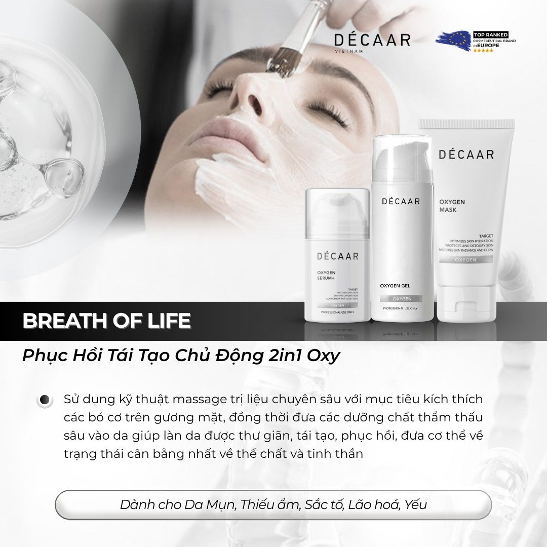- Liệu trình phục hồi hàng rào da: Tập trung củng cố lớp bảo vệ tự nhiên của da, giúp giảm nhạy cảm và tăng khả năng tự phục hồi. Phù hợp với làn da yếu, da đang điều trị hoặc cần ổn định trước Tết. Và Breath Of Life là gợi ý của Décaar, liệu trình phục hồi tái tạo chủ động giúp làn da được phục hồi mạnh mẽ và giảm downtime